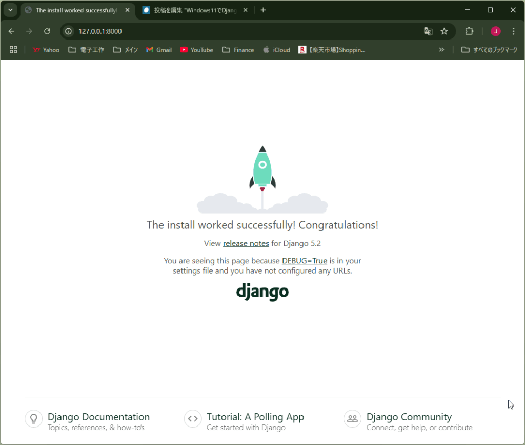 Webブラウザからhttp://127.0.0.1:8000にアクセスします。